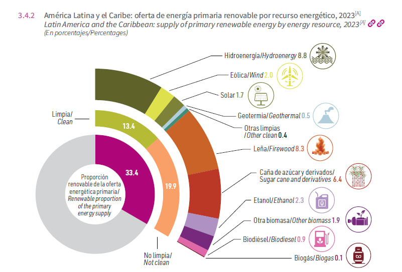 En 2022, el 32,55 por ciento del consumo final total de energía provino de fuentes renovables, una proporción superior al promedio mundial. Sin embargo, dentro del bloque renovable persiste una división entre energías limpias y no limpias (como la biomasa tradicional), lo que matiza el balance ambiental de la matriz energética regional.