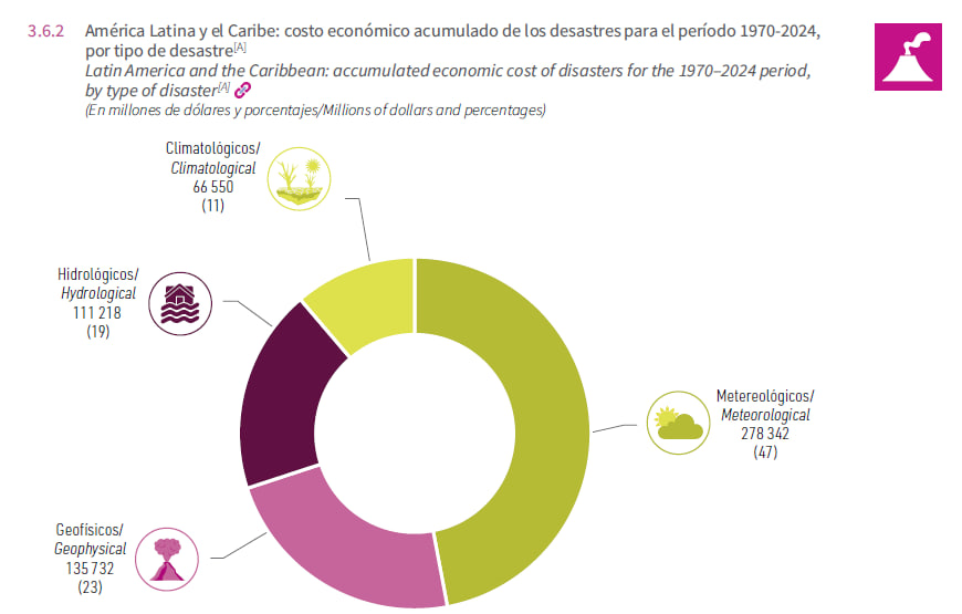 Durante 2024 se registraron 82 desastres en la región, 79 asociados a fenómenos climáticos y tres de origen geofísico. El saldo fue de más de 12,2 millones de personas afectadas, 862 fallecimientos y pérdidas económicas estimadas en 21.777 millones de dólares. Estas cifras refuerzan la paradoja regional: una contribución relativamente baja a las emisiones globales, pero una elevada exposición a los impactos del cambio climático.