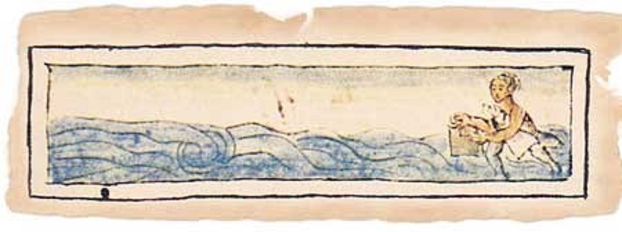 La reproducción pictográfica, contenida en el Códice de Francisco de Sahagun, muestra a un aborigen tomando trozos de bitumen en la orilla del mar.