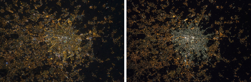 Acá se ve la transición a la tecnología LED en el centro de Milán. La foto de la izquierda fue tomada por el astronauta neerlandés André Kuipers en 2012 y la de la derecha por la astronauta italiana Samantha Cristoforetti en 2015. Cortesía de la ESA