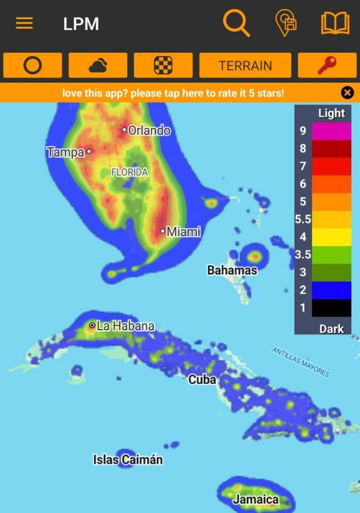 Mapa de Cuba y la clasificación en la escala de Bortle de cada parte de su territorio./Captura de pantalla de la aplicación Light Pollution Map