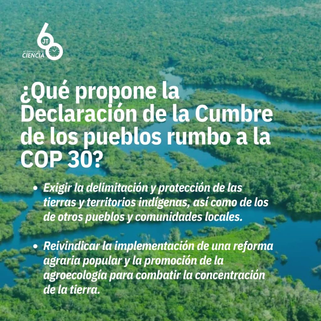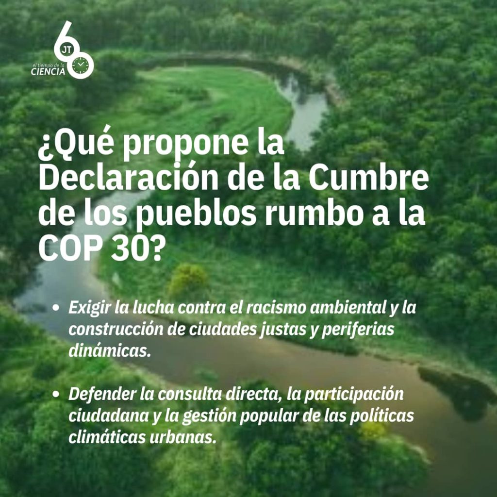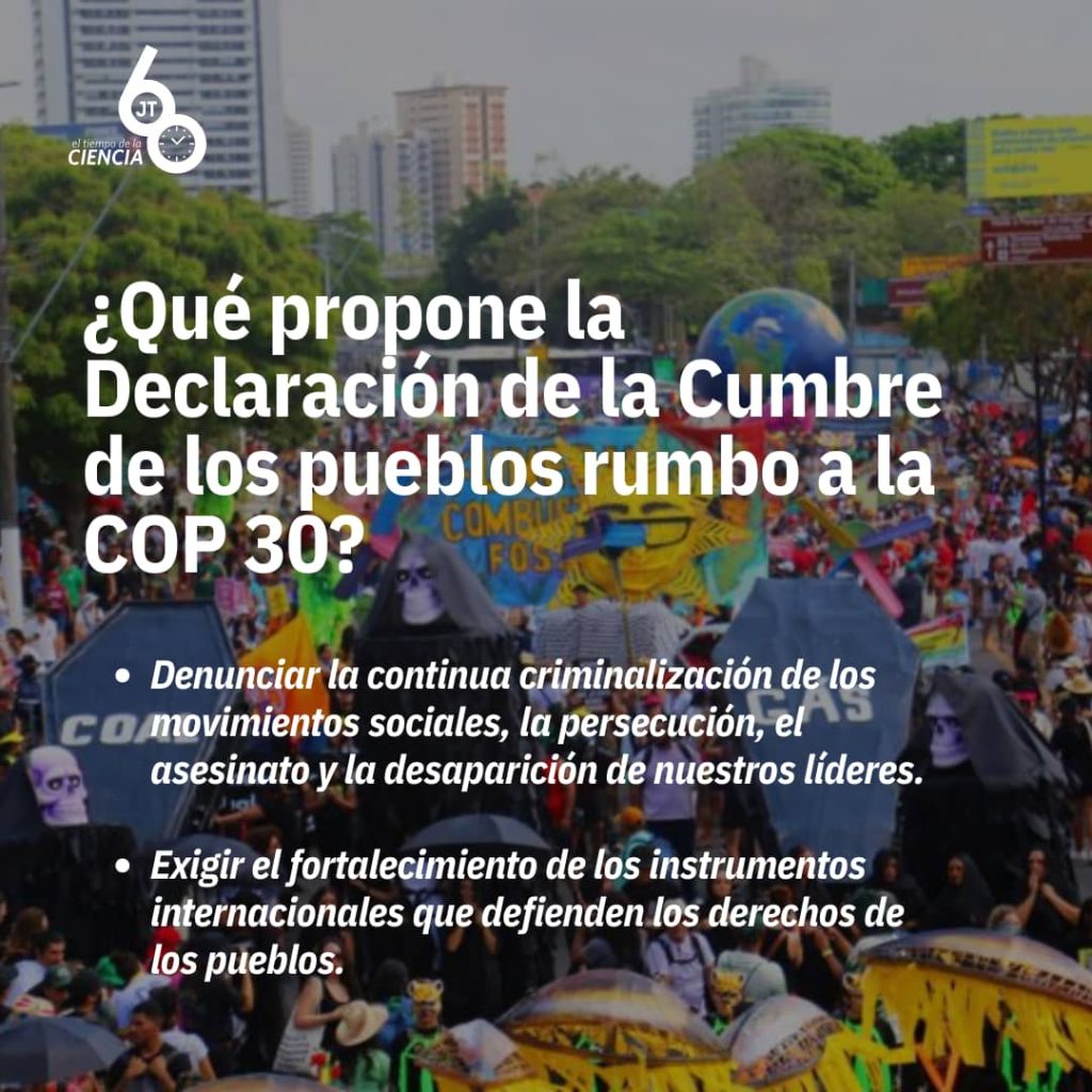 El documento resume el sentir de las más de 70 mil personas que participaron en la Marcha Global por el Clima, tanto en Belem, como en otras ciudades del mundo: “pueblos originarios y tradicionales, campesinos, indígenas, sindicalistas, personas sin hogar, mujeres, la comunidad LGBTQIAPN+, jóvenes, afrodescendientes, habitantes del bosque, del campo, de las periferias, de los mares, ríos, lagos y manglares…