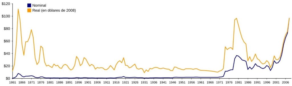 Evolución de los precios del petróleo en dólares estadounidenses. En azul los precios reales, en amarillo los precios ajustados a la inflación.