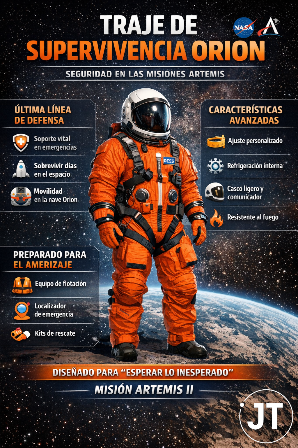 Traje espacial llevado por la tripulación de Artemis II, nombrado oficialmente Sistema de Supervivencia de la Tripulación de Orion./Infografía generada con ChatGPT a partir de datos proporcionados por la NASA