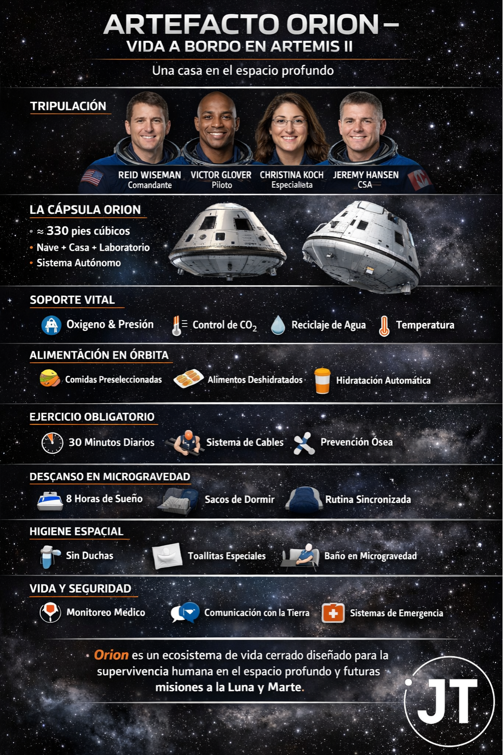 En artículos publicados por la NASA, se explica que la nave Orion tiene un volumen habitable de 950 metros cúbicos. Cuenta con un dispensador de agua y un calentador de alimentos para rehidratar y calentar la comida. El área de higiene incluye puertas para mayor privacidad, un inodoro y espacio para que la tripulación lleve sus kits de higiene personal./