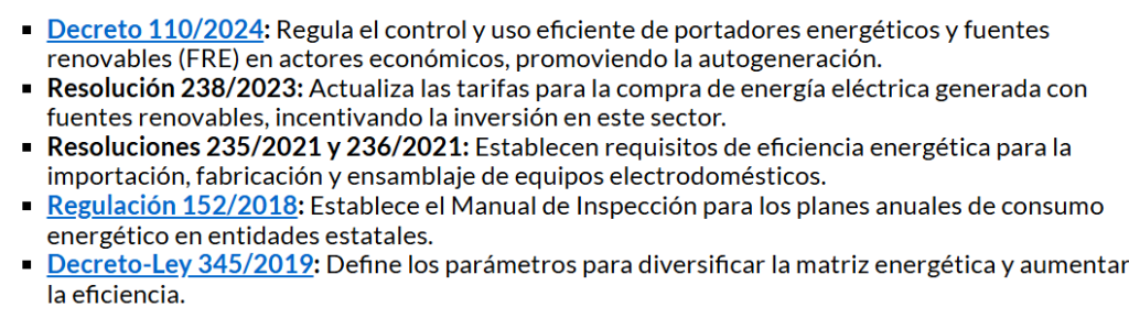 Si al lector le interesa el tema, sería bueno que preste atención al resumen que le dejo a continuación. La ONURE en Cuba regula el uso eficiente de la energía a través de normativas enfocadas en el sector estatal y económico, destacando el Decreto 110/2024, que obliga a empresas (estatales y privadas) a controlar el consumo, adoptar fuentes renovables y enfrentar sanciones. Se implementan medidas técnicas para equipos eléctricos y planes de ahorro obligatorios. Las inspecciones de la ONURE evalúan la gestión energética de las entidades, calificándolas y aplicando medidas ante violaciones. Lease cada resolución e imagine cómo puede cumplirla usando LDT NEXUS ENERGY.