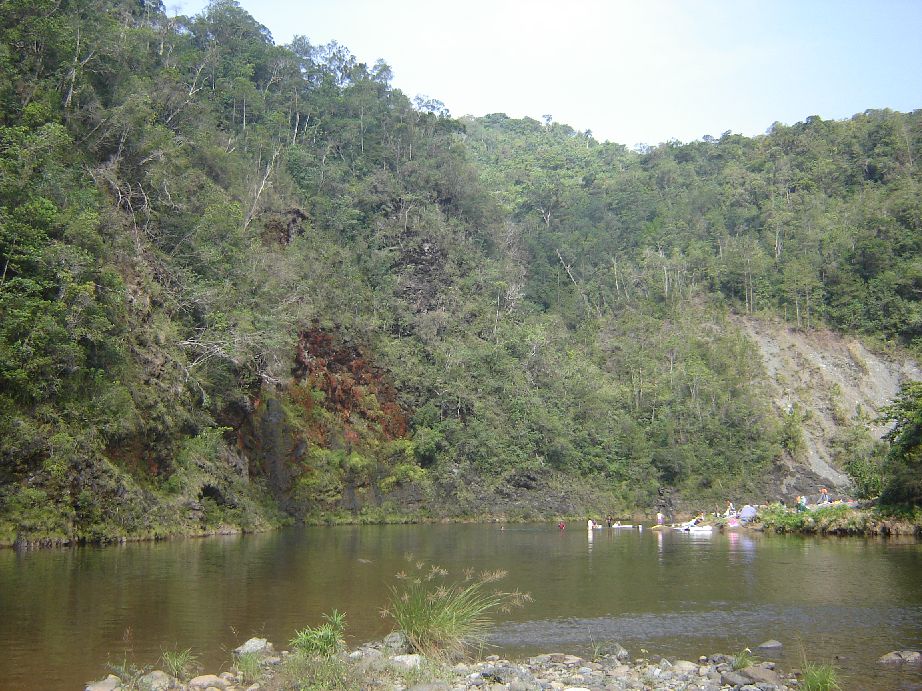 Dejamos detrás la playa de la acampada y nos adentrarnos en el monte por un claro camino. En un tramo, el camino bordeó un barranco y desde allí pudimos ver en la orilla contraria del Toa una ladera erosionada debido a los desprendimientos de tierra que causan las crecidas. La senda nos llevó a un bosque en terreno llano, desde donde se podía ver en la otra orilla, emergiendo de la vegetación, la boca del río Naranjo, uno de los tres mayores afluentes del Toa. Por los alrededores había varios bohíos.