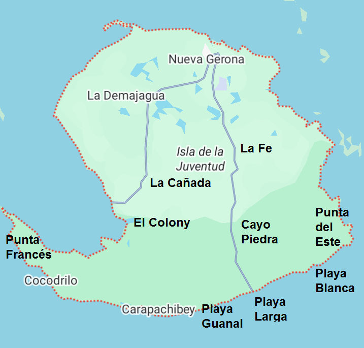Por Pairol, estudiante de electrónica en la Cujae, conocimos Alexis y yo del Sur de la Isla de la Juventud, y nos aventuramos los tres en un fin de semana de 1988 a ir a la Isla a coordinar un viaje con colegas de nuestra graduación, con quienes ya habíamos ido al Turquino. Hechas las coordinaciones, fuimos entonces en un gran grupo de más de 40 estudiantes de la Cujae, y recorrimos en dos guaguas, hermosos lugares del Sur de la Isla.