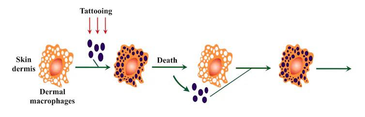 Los macrófagos son células presentadoras de antígenos (APC), fagocitan a los invasores y se los muestran a los linfocitos T, o los eliminan directamente una vez engullidos en sus compartimentos lisosomales. La función de los macrófagos aquí sería desaparecer la tinta y reparar las lesiones ocasionadas. Sin embargo, los tatuajes no desaparecen porque el carbono mineral o metales que contiene la tinta no son biodegradables. Es la razón por la cual, a pesar de que el macrófago ponga todo su empeño, no es capaz de destruirlos y lo único que consigue es almacenarlos en vesículas en su interior.