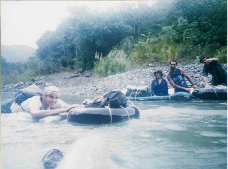 Rabih, Ángel y yo llegamos a la playa de acampada ya de noche, después de tirarnos a oscuras por el rápido que le precedía. Pero aún faltaba Frank, por lo que Ángel y yo decidimos regresar a buscarlo. Tras caminar varios cientos de metros río arriba, lo encontramos en tremendo tropelaje, porque se le habían zafado las cosas. Entre los tres nos repartimos los bultos de Frank y caminamos hasta el campamento, dando tumbos por el río. Unos buenos espaguetis nos esperaban para aplacar el hambre agigantada. Luego el sueño se encargó de clausurar una trepidante jornada, en la que Mal Nombre terminó acampando en dos playas del río Toa.