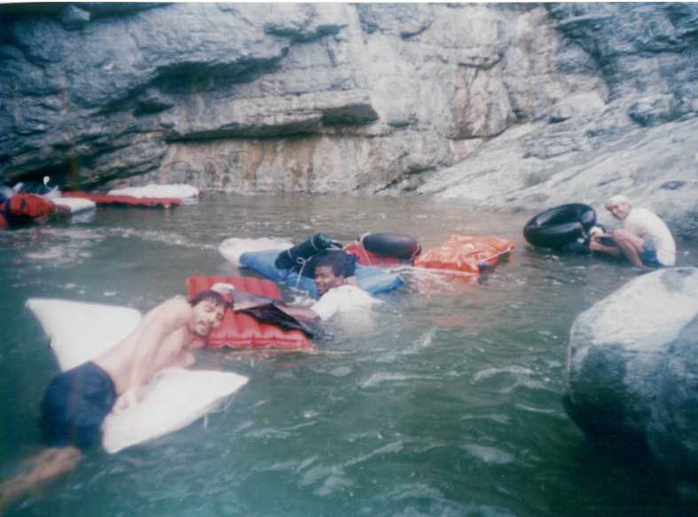 Decididos a no tirarnos por allí dada la mala experiencia vivida en el lugar en el año 96, me trepé en al farallón de la izquierda y le dije a Adrián que lanzara las balsas. Eso hizo, y la de él y la mía se enredaron al caer en el remolino. Ambas balsas daban vueltas y más vueltas sin salir del atolladero y comenzaron a salirse las cosas de las mochilas. Otras balsas se enredaron también, formándose una gran trabazón.