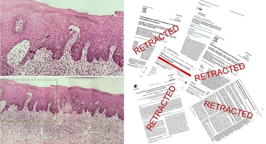 Dos microfotografías de tejidos que aparecen en un artículo de 2004 en The New England Journal of Medicine, que supuestamente fueron tomadas a dos pacientes en diversas fases de cáncer epitelial, son en realidad aumentos diferentes de la misma foto, lo que no fue detectado cuando se aceptó la publicación. En la figura se ve con facilidad que la de arriba es idéntica − algo corrida a la derecha − a lo encerrado en el recuadro de la figura de abajo.