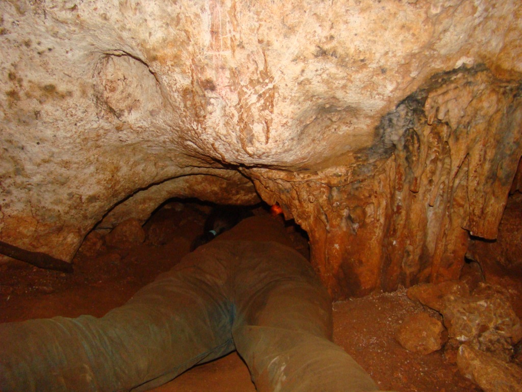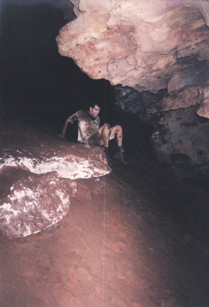 Hice un lazo con un extremo de la soga y rodeé una piedra para hacer la sujeción. Lancé luego la larga soga por el hueco. Listo ya, me dejé caer aguantado de la soga, hasta pisar un fondo inclinado, unos tres metros más abajo. Pedí entonces mi farol, lo cogí y lo coloqué un poco más arriba de donde estaba parado, en una esquina, para alumbrar la bajada. Después de mí, venía un descenso de unos cuatro metros con inclinación entre 30 y 45 grados, hasta una piedra intermedia, para luego continuar el descenso unos diez metros o algo más, con similar inclinación. El fango adornaba el recorrido; las nalgas jugarían su papel.