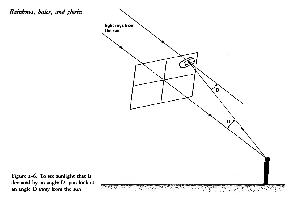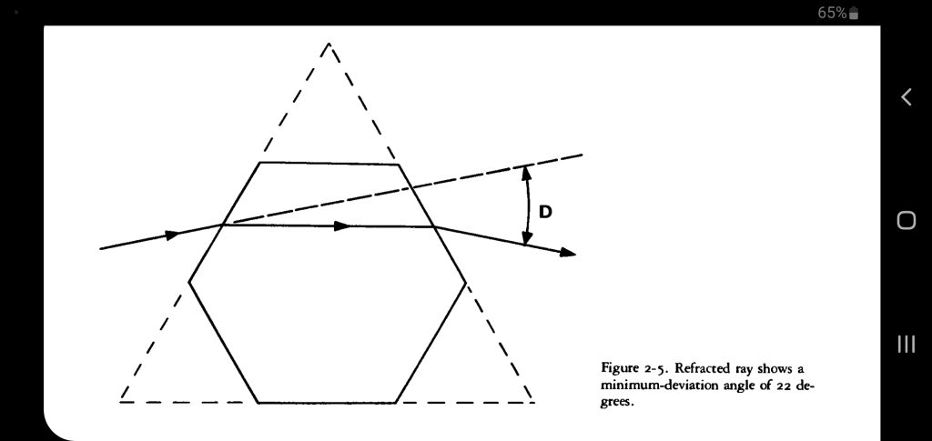 Para el halo de 22 grados, la luz se desvía exactamente como si hubiera pasado a través un prisma de 60° hecho de hielo, con un ángulo de desviación mínimo de 22 grados. Cerca de esta orientación de desviación mínima, la dirección del rayo emergente cambia muy poco cuando el cristal se gira varios grados en cualquier dirección. Como resultado, cuando los rayos de luz pasan a través de cristales con todas las orientaciones posibles, hay una concentración de rayos desviados en ángulos cercanos a 22 grados.