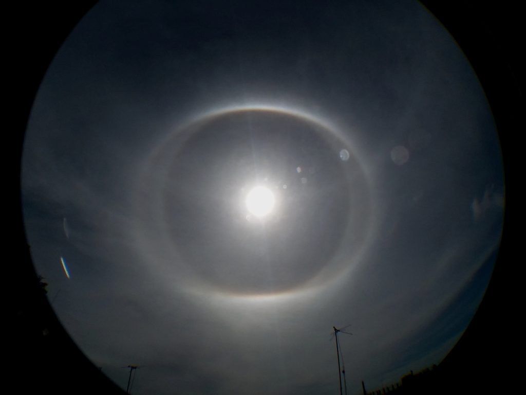 Un halo solar es un anillo luminoso que se forma alrededor del Sol cuando la luz solar interactúa con millones de diminutos cristales de hielo hexagonales suspendidos en la atmósfera. Estos cristales actúan como pequeños prismas que refractan y reflejan la luz, desviándola en ángulos específicos y separándola en sus colores componentes, de manera similar a como lo hace un prisma de vidrio.