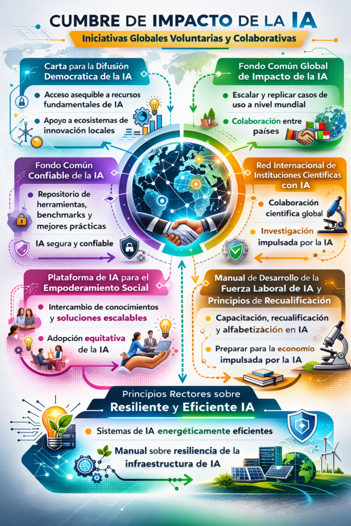 Además, la Cumbre presentó iniciativas como la Carta para la Difusión Democrática de la IA, un Fondo Común Global de Impacto de la IA, un repositorio de herramientas y mejores prácticas, y la Red Internacional de Instituciones Científicas con IA. Se trata de mecanismos voluntarios y colaborativos, concebidos como plataformas de coordinación más que como instrumentos regulatorios vinculantes.