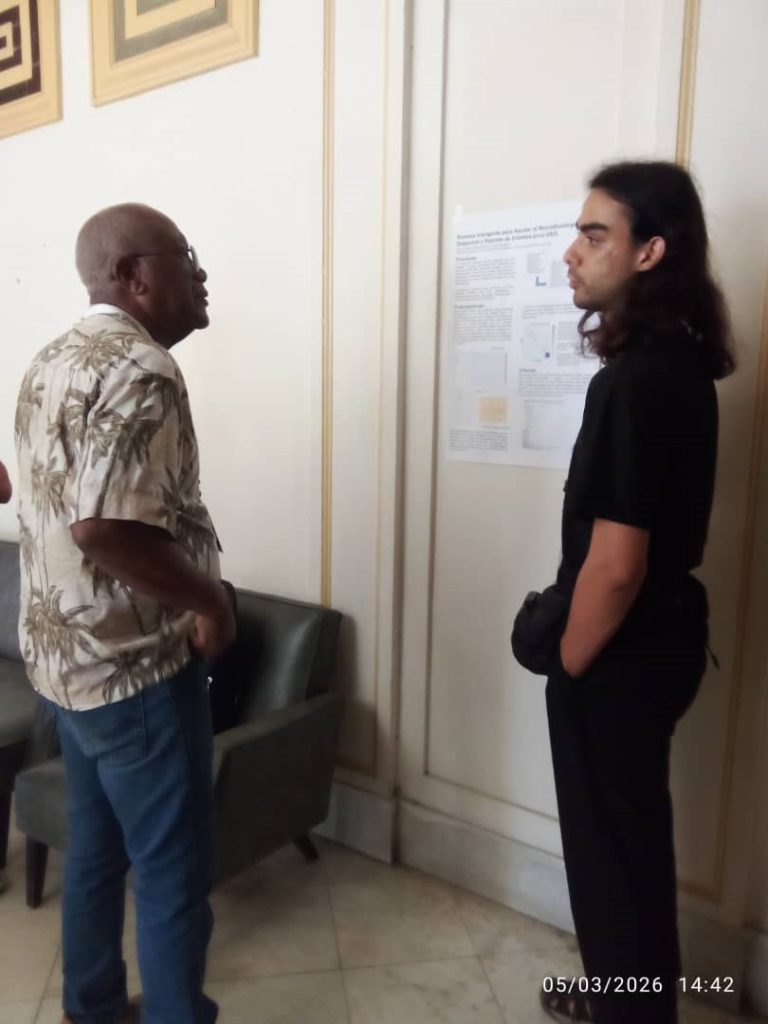 Durante la sesión presencial de JUL.IA hubo una sesión de pósters. Lia Molier, de la Facultad de Física de la Universidad de La Habana presentó una investigación sobre modelos de IA para predecir la profundidad anestésica, mientras que Eduardo Martínez, Eduardo Garea y Arturo Duarte mostraron un sistema inteligente de ayuda a los neurofisiólogos, colaboración entre el Centro de Neurociencias y la Facultad de Física.