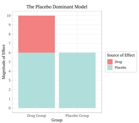 Este poder, sin embargo, supone un gran desafío para la investigación farmacéutica. Como ilustra el modelo de la figura 1 en el grupo que recibe un fármaco, una gran parte del efecto positivo proviene de la respuesta placebo (la base de la barra), mientras que el efecto farmacológico real puede ser comparativamente pequeño. Si la respuesta placebo es lo suficientemente fuerte, este beneficio adicional se vuelve estadísticamente invisible, llevando a que fármacos potencialmente útiles sean rechazados.