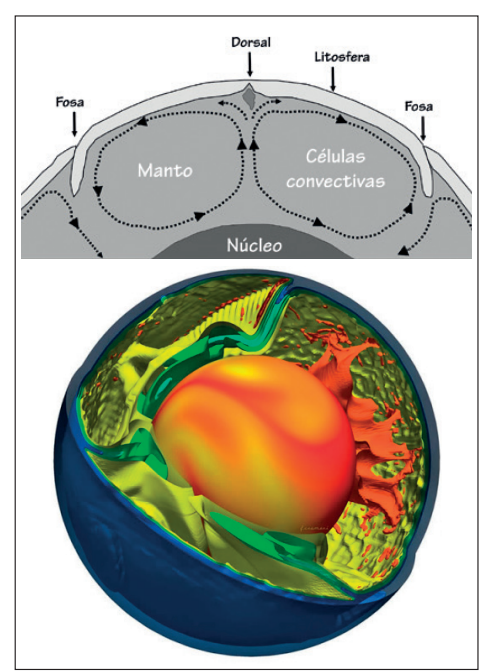 Dos modelos de convección en el manto: a) patrón clásico de células convectivas y b) imagen moderna de la convección mantélica.
