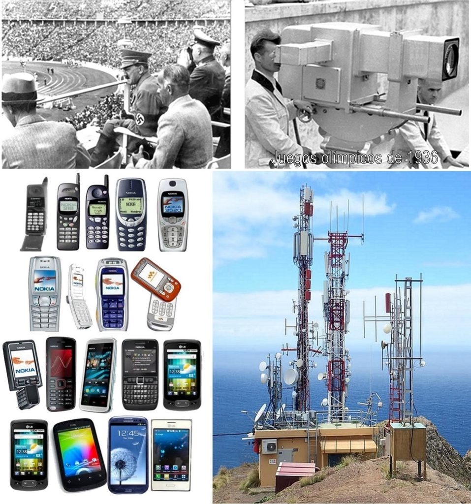 Más tarde llegó la radiodifusión tal como la conocemos hoy (1906), aunque las primeras emisiones comerciales no comenzaron hasta 1920. Después apareció la grabación magnética (1898), la TV rudimentaria (1926), y toda una serie de dispositivos de comunicaciones hasta llegar a los actuales celulares, con transmisión de imágenes a tiempo real. La foto anterior muestra una cámara de TV registrando los Juegos Olímpicos de Berlín de 1936; más abajo, evolución de los celulares a partir de los primeros modelos y algunas antenas modernas de comunicaciones.