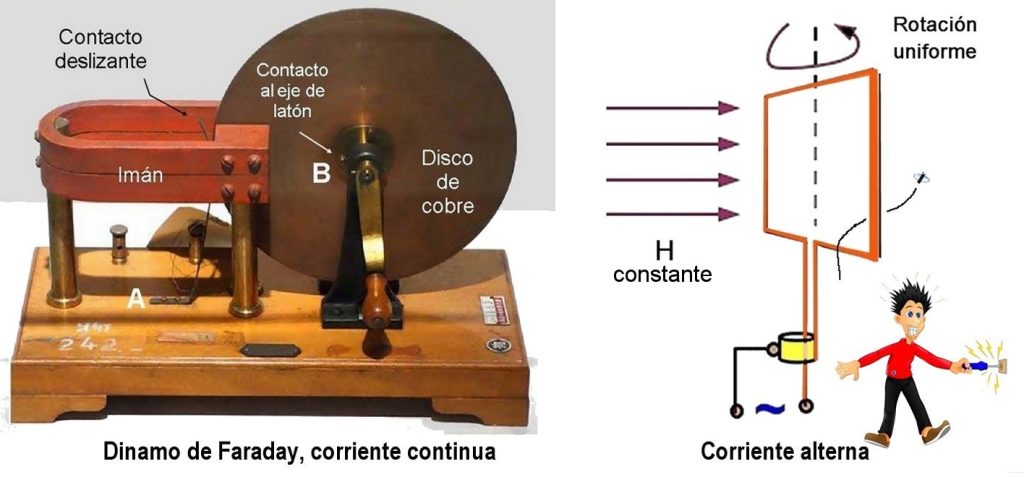 Otro progreso importante en el desarrollo del conocimiento sobre el tema ocurrió en 1832, cuando Michael Faraday descubrió cómo producir energía eléctrica sin usar baterías. Encontró que un conductor moviéndose en un campo magnético constante puede producir energía eléctrica, y construyó el primer dinamo o generador capaz de transformar la energía mecánica en una corriente continua CC.