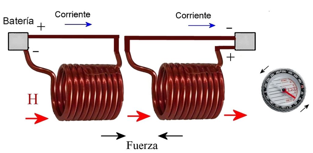 En la figura, la corriente en los enrollados de alambre (bobinas) refuerza el campo magnético en su interior y sus alrededores; ambas bobinas se comportan como imanes y se atraen. Si el sentido de la corriente se invierte en alguna de ellas, también lo hace el sentido de H, y las bobinas se repelen.