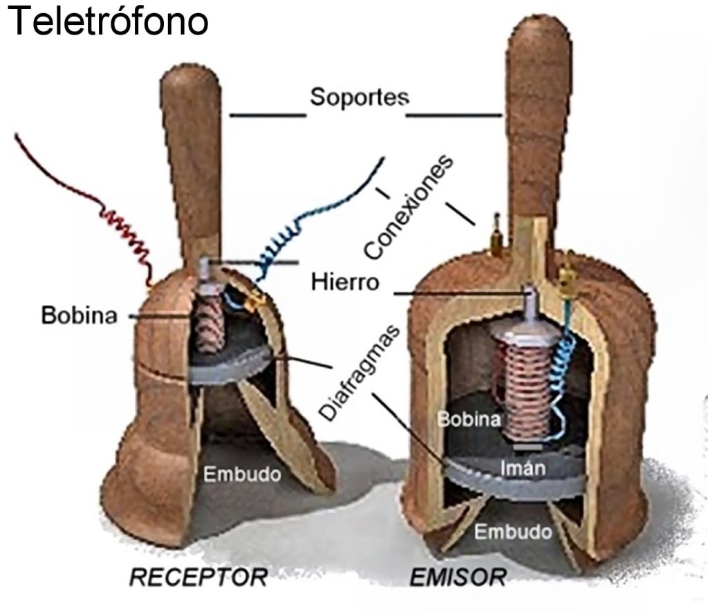 El teletrófono se creó en1854 al aparecer bocinas que, mediante imanes y láminas de acero, permitían transformar el sonido en corrientes eléctricas y viceversa. A partir de ese momento los hallazgos se multiplicaron y pronto aparecieron los generadores de CC movidos por turbinas, los motores de CC, la luz de arco eléctrico y el bombillo incandescente.