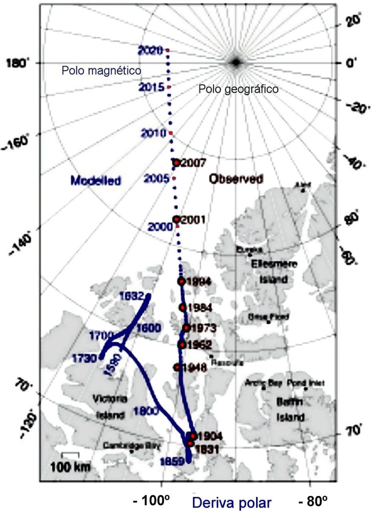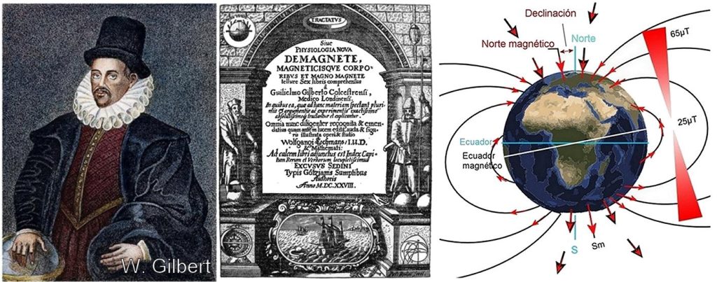 En 1600 William Gilbert, filósofo, ingeniero, físico y astrónomo, nombrado médico de la reina Isabel I de Inglaterra en 1601, logró explicar la desviación entre la dirección que marcaba la brújula y el norte geográfico al considerar que la tierra era un imán gigantesco, con sus polos magnéticos situados a cierta distancia de los geográficos. El polo norte o positivo de la aguja siempre apunta al polo magnético norte, no al geográfico; la diferencia entre la dirección norte que indica la brújula y la real del norte geográfico se llama declinación magnética (ver figura).