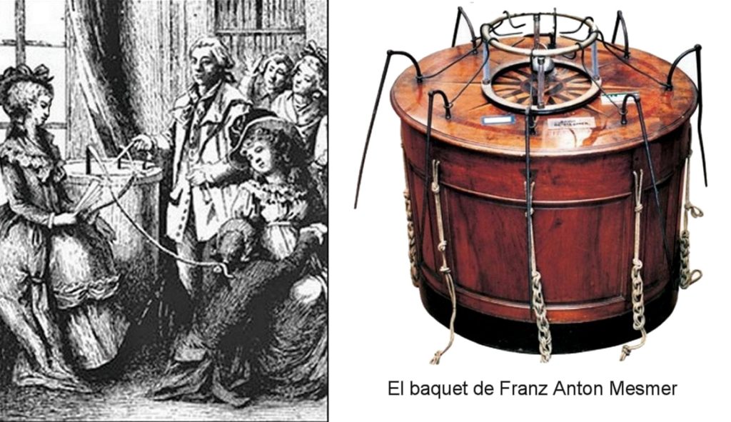 La figura a la izquierda muestra un dibujo de un periódico parisino de la época; Franklin, presidente de la comisión, aparece a la izquierda con los documentos que declaran el magnetismo una farsa. Mesmer, con grandes orejas de burro, es expulsado del recinto junto a su séquito.