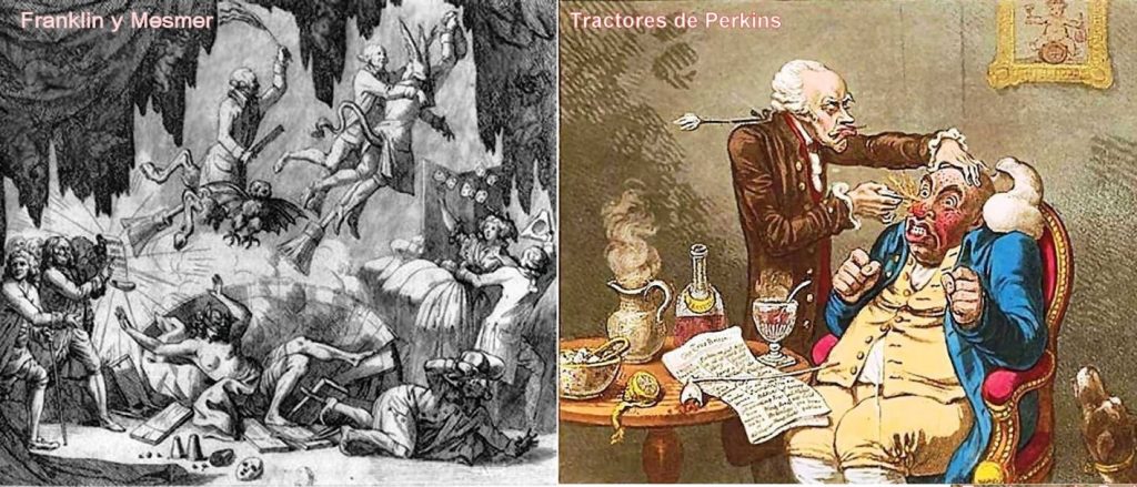 Elisha Perkins. Otro caso de cierta relevancia de la misma época, con similar confusión entre electricidad y magnetismo, fue el del médico Elisha Perkins. Utilizaba “tractores metálicos” para el tratamiento de varias enfermedades en personas y caballos. Los tractores (dos conos confeccionados de metales diferentes, sin propiedades magnéticas) se utilizaban frotando con suavidad el área lesionada, para ‘…extraer el fluido eléctrico nocivo que subyace en la base del sufrimiento’, que Perkins asociaba al ‘magnetismo animal’. La figura a la derecha muestra una caricatura de 1801. Algunos médicos escépticos repitieron sus tratamientos, utilizando piezas de madera talladas y pintadas como los tractores, y obtuvieron resultados similares. Tras publicar sus conclusiones, en 1796 la Connecticut Medical Society calificó a Perkins de farsante y lo expulsó de sus filas.