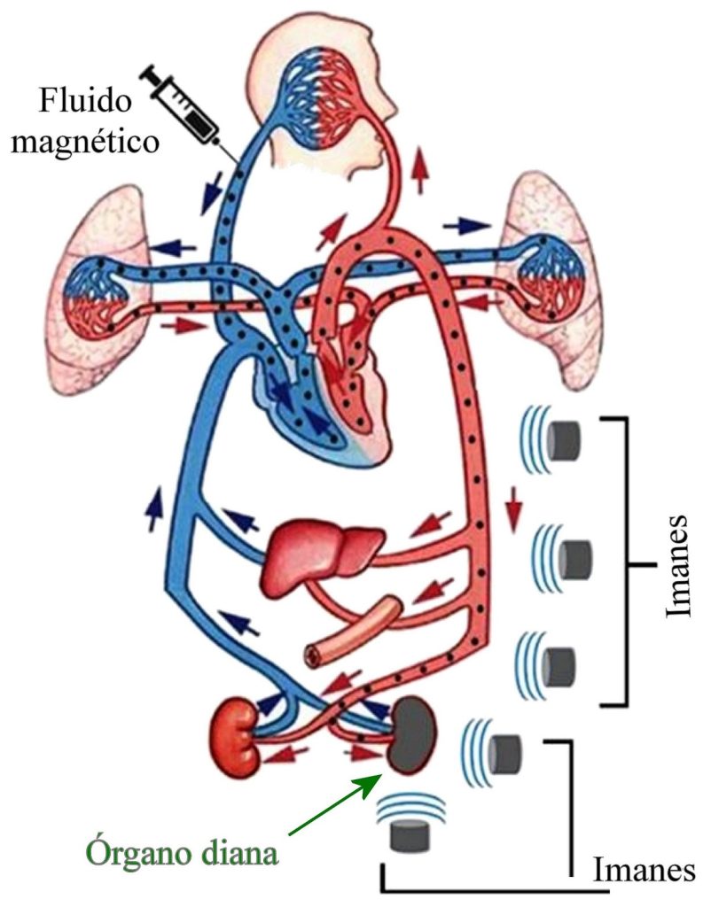 De conjunto con la inyección del fluido magnético en el sistema circulatorio, se colocan uno o más imanes potentes en la región del cuerpo donde se desea concentrar el fármaco, de manera que las nanopartículas tienden a aglomerarse en esas regiones, como se ve en la figura. Una vez concentradas en el lugar deseado, el fármaco se libera mediante cambios en la actividad enzimática, en la acidez (pH) o en la temperatura.