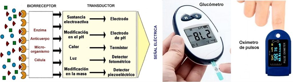 Funcionan sobre la base de principios muy diversos, diseñados para el caso particular que se considere. Un biosensor combina un componente biológico (enzima, anticuerpo, célula, ácido nucleico o microorganismo), el cual se usa como biorreceptor, con un transductor físico-químico (electroquímico, óptico, térmico, piezoeléctrico), que permite detectar de forma cuantitativa un compuesto químico o biológico específico. Ejemplos son: los glucómetros para medir la glucosa en sangre, los tests caseros de embarazo, sensores de COVID-19, o los sensores de toxicidad del agua.