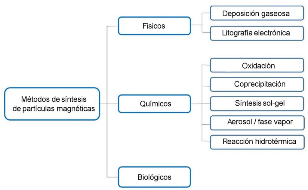 ¿Cómo se obtienen las nanopartículas? Existen métodos físicos, químicos y biológicos para obtener las nanopartículas magnéticas; se resumen en el esquema siguiente. Entre los diversos métodos, los de precipitación y coprecipitación son muy utilizados para obtener nanopartículas de metales como Fe, Ni o Co, y de óxidos como la magnetita Fe3O4 o el óxido γ-Fe2O3.