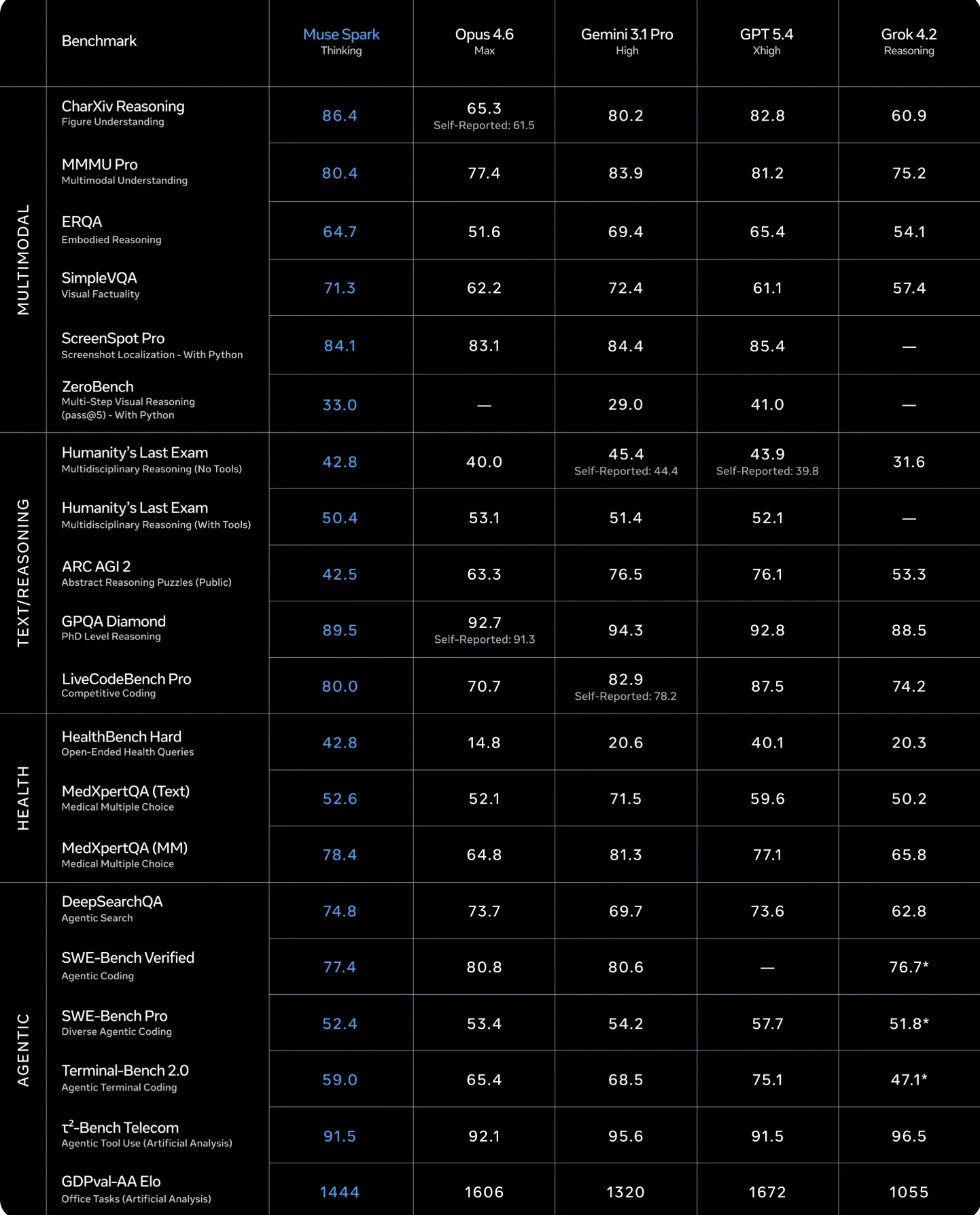 En la tabla anterior, podemos comprobar que Muse Spark supera a otros modelos de la competencia en tareas relacionadas con el procesamiento multimodal. Sus puntuaciones son cercanas en tareas de salud y agéntica. En razonamiento sus rivales dominan con respecto a la nueva herramienta de Meta.