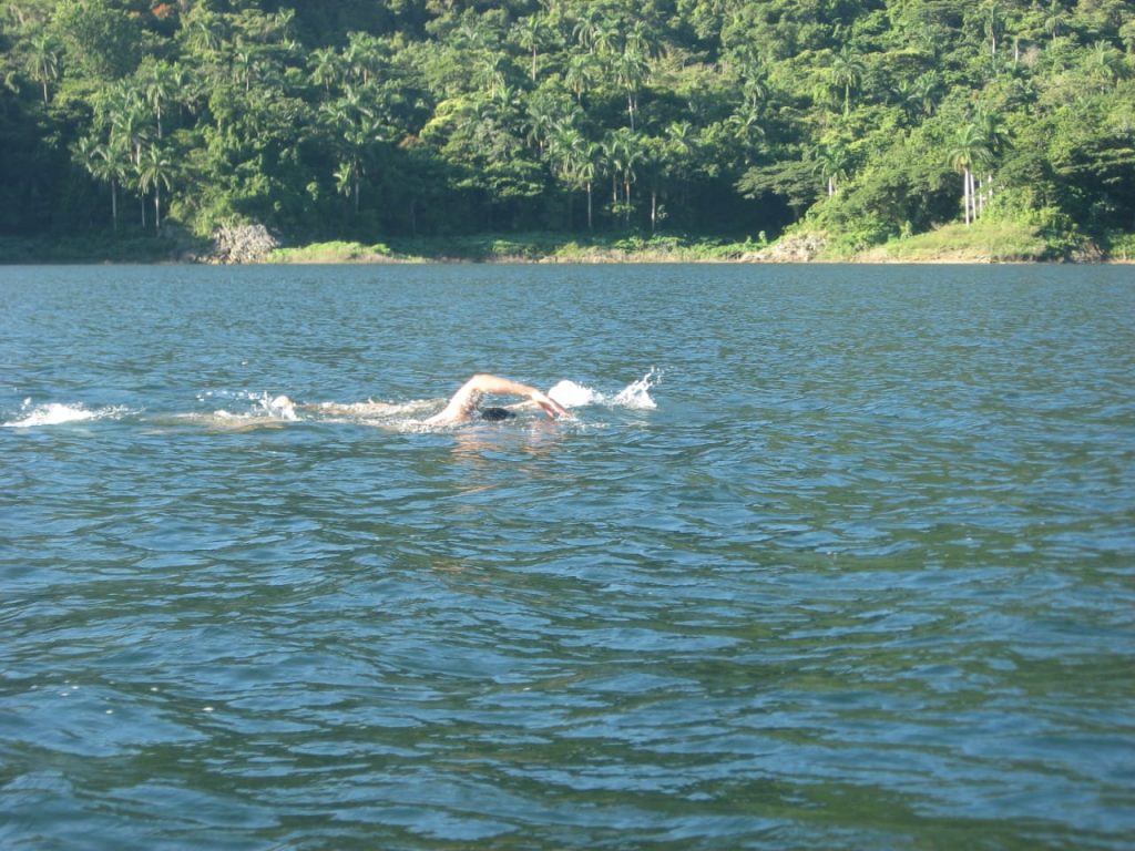 La presa Hanabanilla tiene un largo de 11,5 kilómetros desde el dique de Jibacoa hasta el dique del Salto, pero nos ahorraríamos los primeros 600 metros de la ensenada y 1300 al final, para no ser vistos nadando al llegar. El primer tramo a nadar sería el más largo. Era de unos 3400 metros, hasta poco después de la boca de río Negro. Salimos a nadar Hery, Janett, el Rafa y yo a cappella, mientras Edgardo, Tony y Héctor iban con patas de rana, caretas y snorkel.