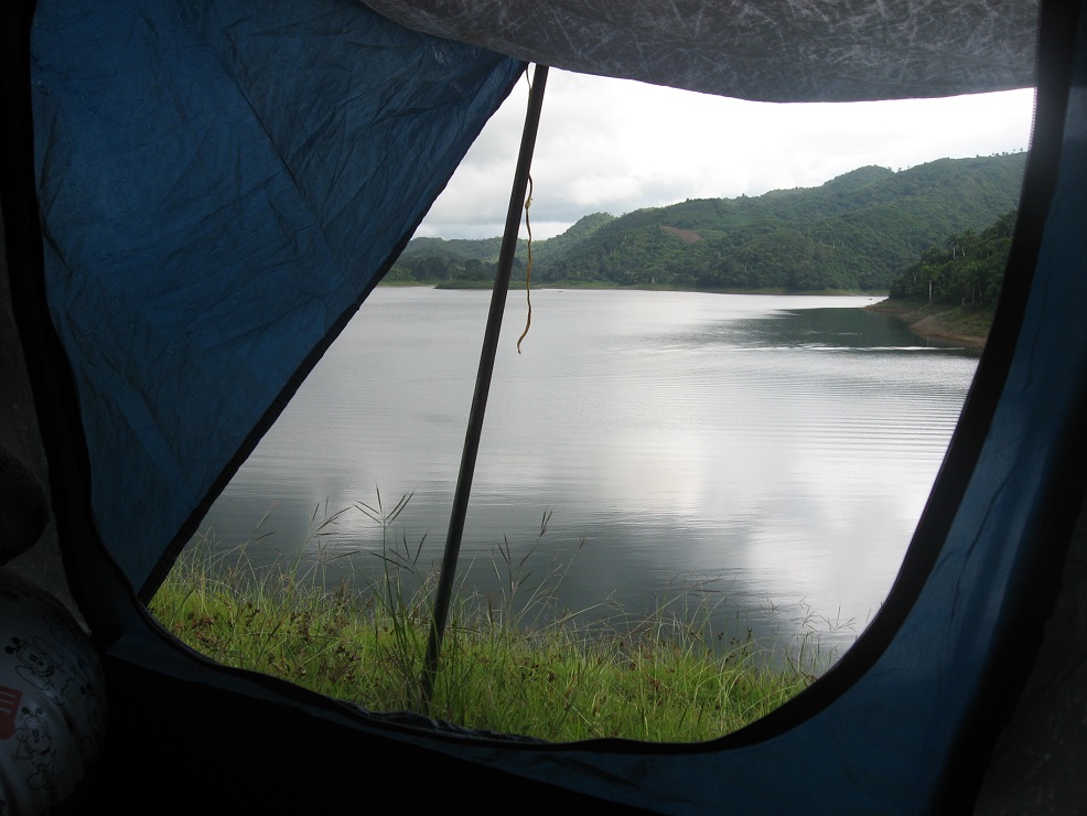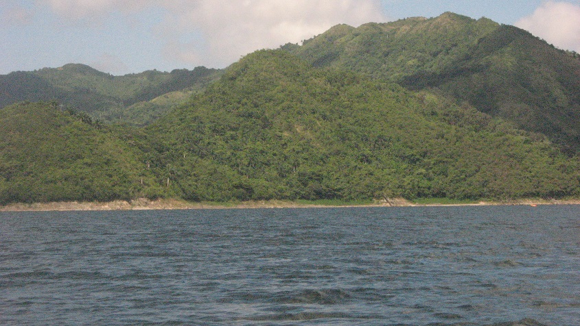 Doblaron los botes el saliente que se mostraba por la izquierda y la visión del hotel nos llegó de súbito. A sugerencia de los lancheros, atracamos a los pies de una ladera cubierta de hierba, construida para hacer de dique a la izquierda del hotel. Nos despedimos de los lancheros y subimos la ladera para comenzar la acampada sobre el firme del dique, justo por donde pasa un camino que se sumerge en el monte y recorre un sendero ecológico llamado “La Atalaya”. Desde arriba, a un lado teníamos la hermosa vista de la presa y al otro una amplia visión que incluía el poblado de Cumanayagua, más atrás la fábrica de cemento Carlos Marx, y al final, por la izquierda, la ciudad de Cienfuegos.