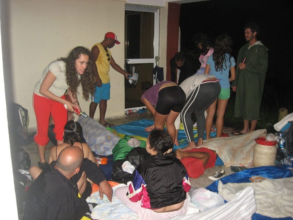 Con la noche cayendo, hicimos una limpieza del suelo en la escuela de esperanto y nos acotejamos para dormir. Pero antes juntamos galletas y dulce de guayaba y formamos un tiroteo, incluyendo la carne preparada, la cual estaba bastante salada. Como no teníamos suficiente agua allí, pasamos trabajo para tragarnos el salado condumio. Como al día siguiente cumpliríamos años Patricia y yo, previo a los festejos ambos recibimos “amenazas” de varios jodedores. En un momento, Bety le dijo a Edgardo que sacara las manos de los huevos y yo me burlé de ella, sacándole chispas al doble sentido. Pero al instante caí en cuenta de que su interpretación podía ser literal, es decir, que pudiera haber huevos de gallinas, esperando por mi cumple.