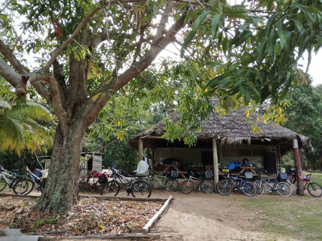 Rodando en busca de la zona protegida del Sur de la Isla, un poco antes del caserío nombrado “Frank País”, se me ponchó una cámara de repuesto que le había puesto a la goma delantera, luego de un ponche en la finca de La Cañada. Justo en ese momento, me entraron serias ganas de “bajar de peso”. Por suerte, no había nadie cerca, porque me hubieran visto en una situación bastante comprometedora al borde de la carretera. Cuando terminé, se aparecieron Rafa, David y Denis. Gracias a una cámara del Rafa, puede seguir rodando.
