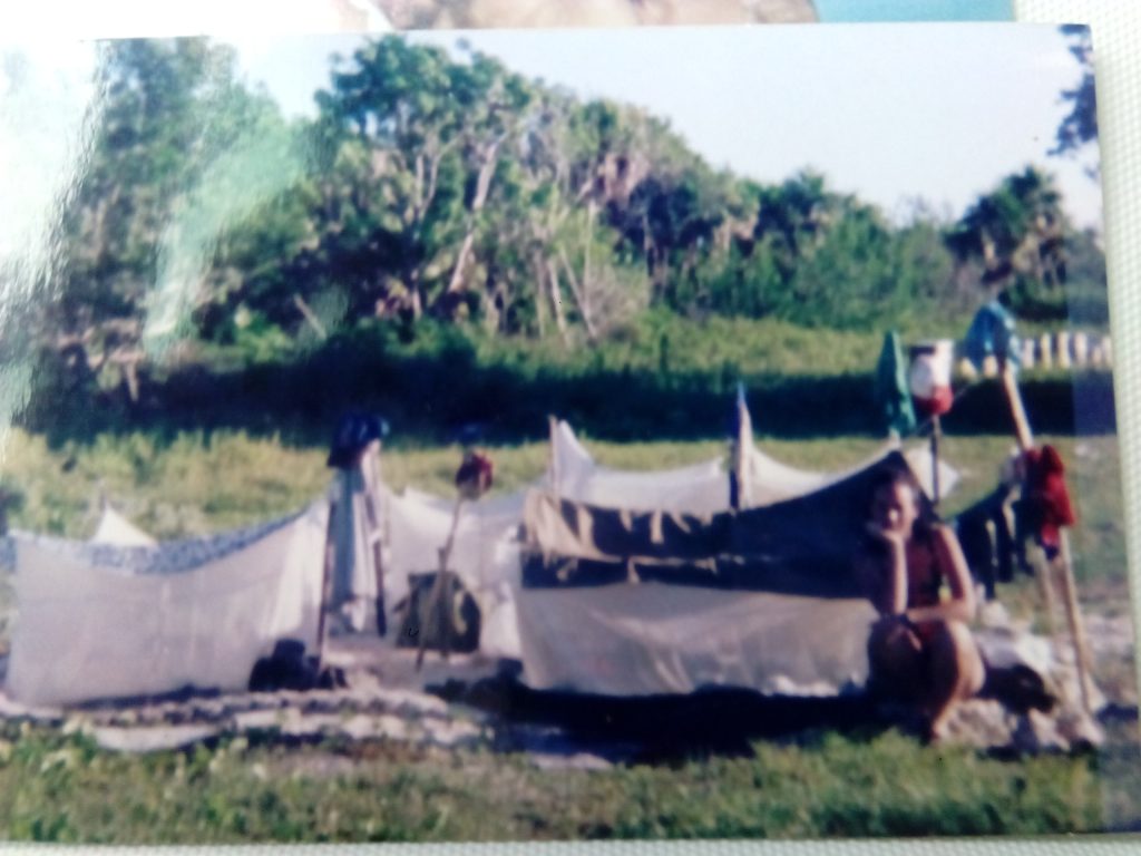 Aquello era una paz de silencio natural. Nada que indicara presencia humana había por los alrededores, salvo los pomos y otros objetos plásticos que recalaban de los barcos. La finísima arena solo era opacada en algunas partes por conglomerados de sargazos. En el extremo izquierdo había varias matas de uvas caletas. Hacia la derecha, en la distancia, se apreciaba una casuarina; al final, veíamos doblar hacia la derecha la línea de la orilla. Comenzamos la acampada al final del camino, frente a la playa. Levantamos los mosquiteros sobre la arena, mientras Adrián armaba su azul tienda de campaña.