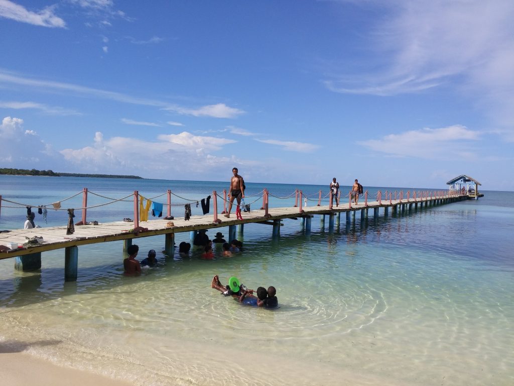 Imagínese llegar con el estrés de tantas penurias a una playa de unos dos kilómetros de largo, con unas tonalidades verdes y azules escandalosas, un agua tranquila y transparente, una franja de arena de más de 30 metros de ancho, una hilera de tumbonas esperándote sobre la arena, un puente extendido hacia adentro del agua unos cien metros, un pintoresco y gran bungaló de madera en medio de aquel arenazo con un acogedor portal con barandas, y un bote plástico a disposición.