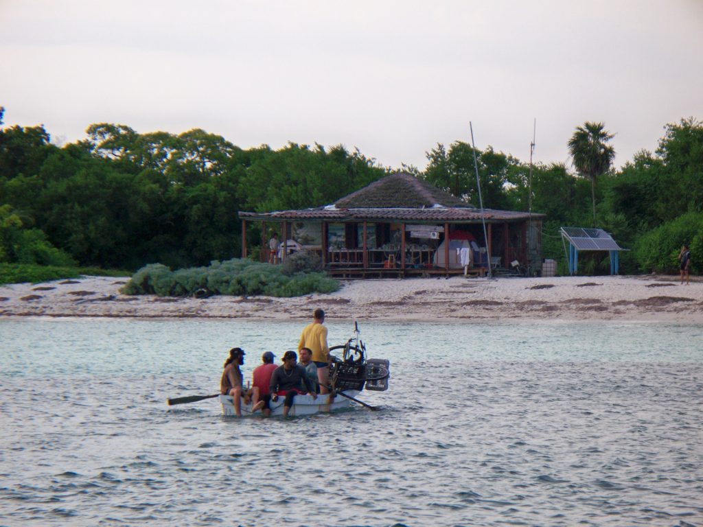 Mientras buceábamos, un yate comenzó a acercarse y Vitico nos agitó para que montáramos en el bote. Ya arriba Eledys y yo, Vitico comenzó a remar con fuerza hasta acercarse al puente y notar que aún había una tienda de campaña armada sobre él. Era la de los más remolones del grupo: Alfredo y el Gabi, y les eché una refriega. Por suerte, el yate siguió de largo sin acercarse a la playa.