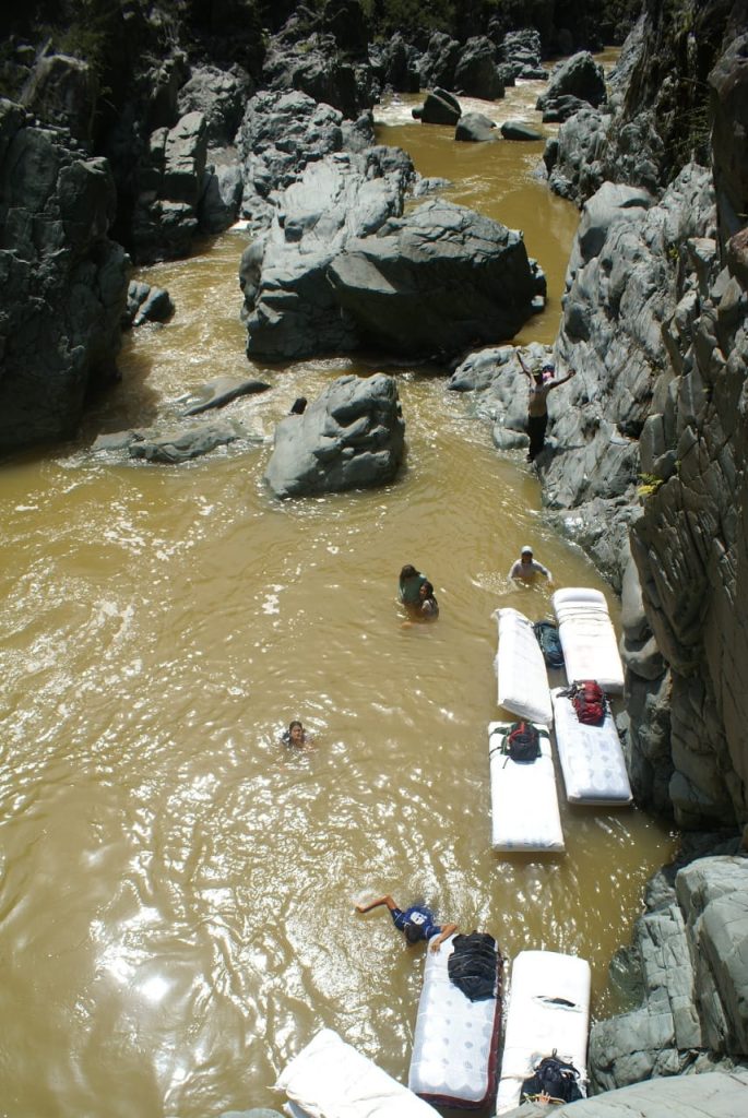 María Karla fue hasta la orilla y, al ver a Edgardo venir, se volvió a montar en su balsa, dejándome a mí con el insulto por mi desventura. Varios del grupo se me ofrecieron para llevarme la mochila, pero yo estaba resuelto a seguir navegando con la mochila. Entonces se me ocurrió un “invento”. Saqué una soga, amarré la mochila por una punta y con la otra hice un lazo. Metí mi pie derecho dentro del lazo y comencé a nadar, arrastrando la mochila por la corriente. Algo parecido ya había hecho en 1999, pero halando una cámara con la mochila. Por supuesto, la mochila sola tenía mucho menos flotabilidad y estaba completamente expuesta a los golpes con las piedras.