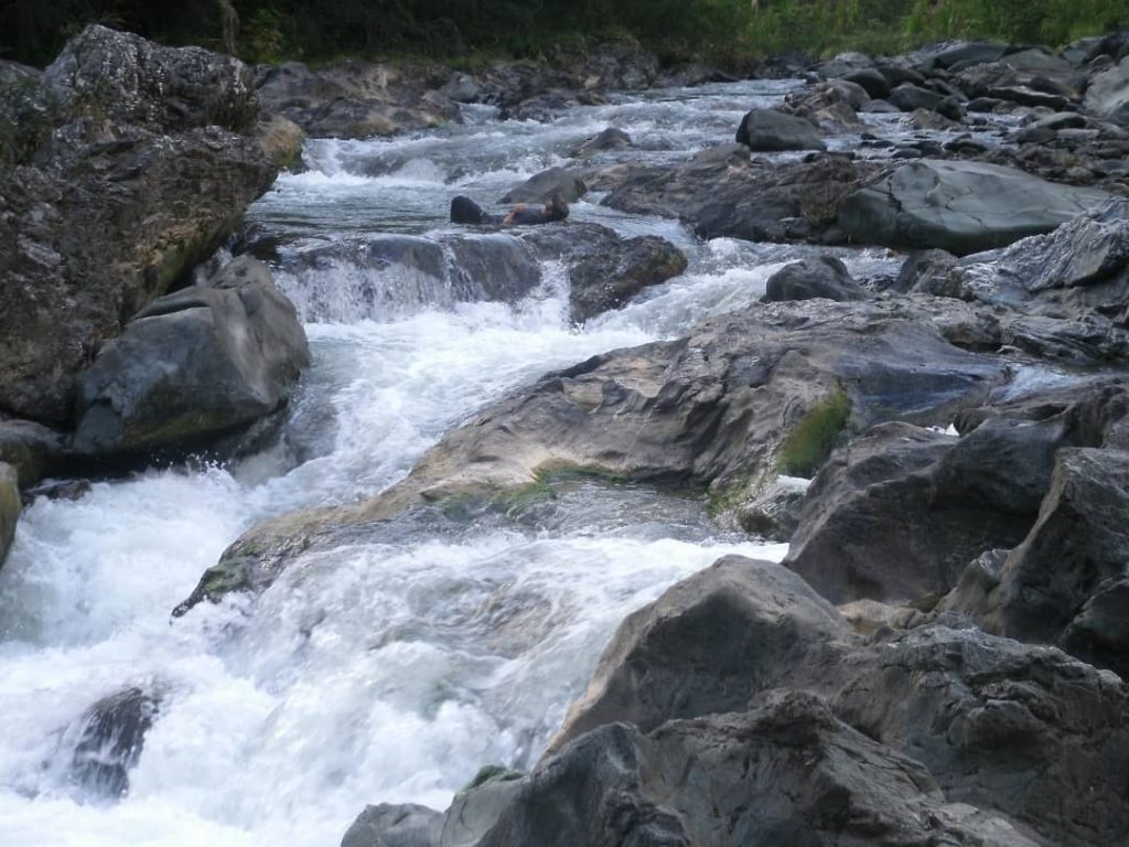 Yo le seguí detrás, pero con menor suerte, pues el peso de mi mochila y mi propio peso corporal me daban una menor flotabilidad. El salto, al tener bastante inclinación, formaba un remolino en su caída. Al llegar al lugar, la cabecera de la balsa se me dobló y me fui de bruces junto con la balsa. Al caer, el remolino dio cuenta de mí, hundiéndome en el chorrero. La presión del agua sobre mi cara me hizo tragar agua, tanto por la boca como por la nariz. Pataleé y pataleé, hasta que logré salir, respirando de inmediato unas grandes y oportunas bocanadas de aire.