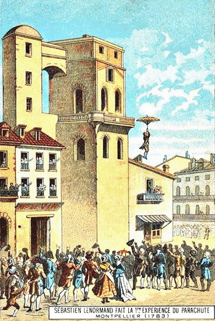 Louis-Sébastien Lenormand, el hombre que realizó en 1783 el primer salto documentado en paracaídas, que él mismo había inventado. https://www.labrujulaverde.com/2019/10/louis-sebastien-lenormand-el-hombre-que-realizo-en-1783-el-primer-salto-documentado-en-paracaidas-que-el-mismo-habia-inventado,