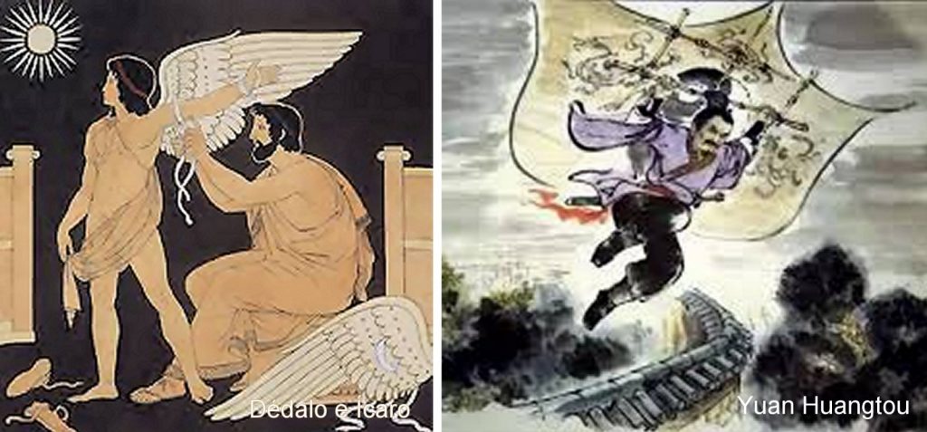 Descontando la leyenda griega sobre Dédalo e Ícaro, ─ quien murió al acercarse mucho al sol, por derretirse la cera con la que su padre había pegado las plumas a unas alas artificiales ─ está documentado que en el año 559 el emperador chino Gao Yang ordenó a Yuan Huangtou, hijo del anterior emperador, lanzarse desde lo alto de una torre con una cometa preparada al efecto. Yuan logró planear sobre las murallas hasta las afueras de la ciudad, pero poco después fue ejecutado.