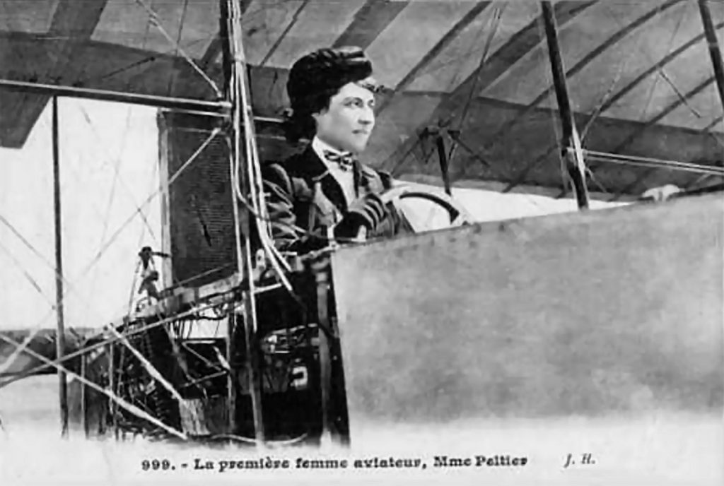 Algunos alegan que la escultora Thérèse Peltier, amiga del escultor parisino y aviador Leon Delagrange, fue la primera mujer pasajera en un aeroplano en julio de 1908, y recorrió unos 300 metros. Después aprendió a volar y realizó varios vuelos en solitario, pero nunca llegó a obtener una licencia oficial.