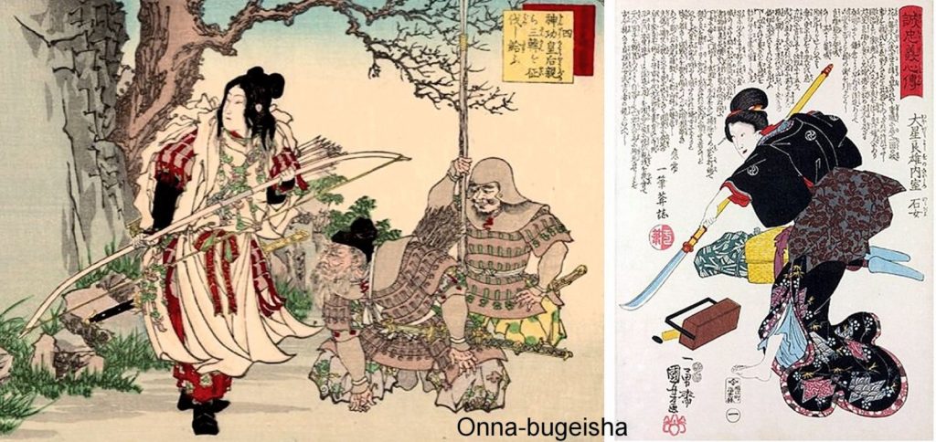Las Kunoichi no deben confundirse con las Onna-bugeisha, miembros de la clase samurái, adiestradas en el uso de las armas para proteger su casa y su familia en tiempos de guerra. Se entrenaban en el uso del arco y flecha y en la naginata, un tipo de lanza de hoja curva.