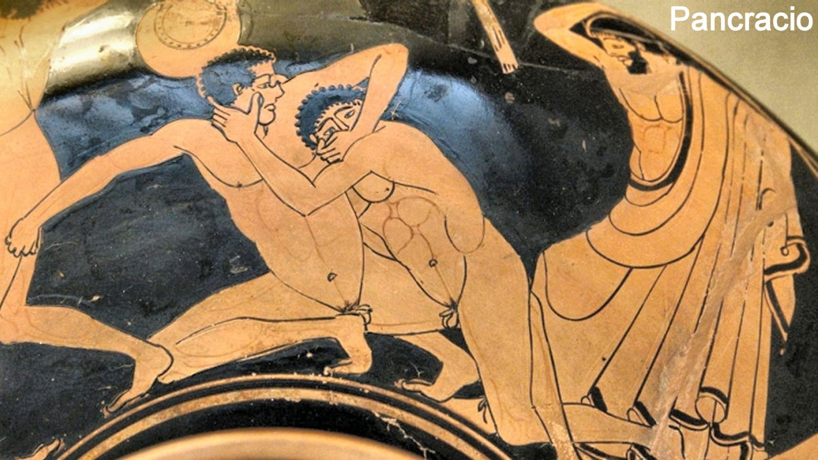 La figura muestra el grabado en una copa griega del 480 a.n.e. que se atesora en el Museo Británico. Un contendiente intenta meter un dedo en el ojo de su adversario, y el árbitro interviene con un látigo para castigar la falta.