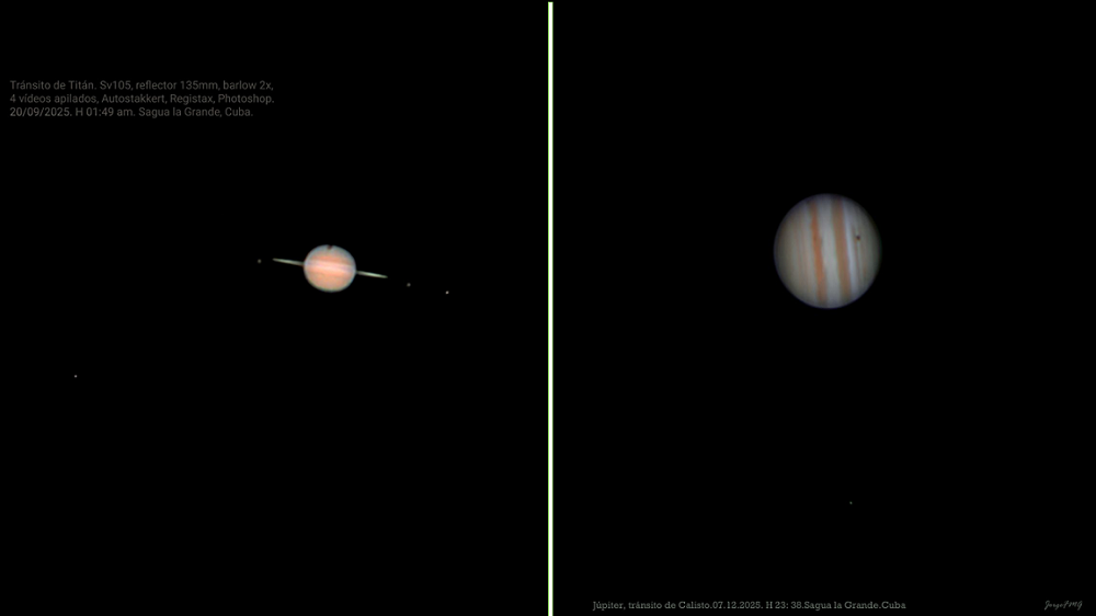 – Tránsitos de las lunas: Se pudo seguir el ballet de las lunas galileanas proyectando sus sombras sobre Júpiter, así como la serie de tránsitos de Titán y su sombra sobre Saturno. Especialmente visible entre agosto y octubre, esta última serie fue un fenómeno único que no se repetirá con tanta claridad en 15 años. Desde nuestra geografía el único astrónomo amateur, que se sepa, capaz de capturar este singular evento, fue el villaclareño Jorge Félix Morales.