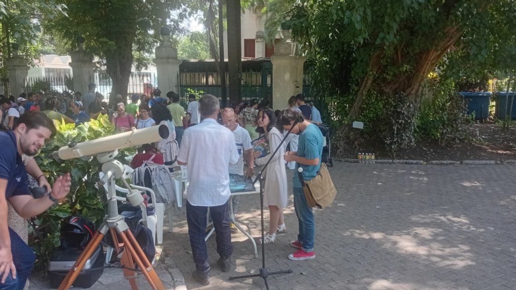 Los telescopios fueron un gran atractivo, en particular para los asistentes más pequeños, quienes quedaban asombrados por su presencia; su curiosidad intrínseca les motivaba a mirar a través del ocular. Lastimosamente no se llevaron la experiencia de ver las estrellas, pero para compensar esto, colocamos un cartel del Sistema Solar en un extremo del parque y preguntábamos a los visitantes cuáles eran los planetas que lograban ver. Luego, en las horas del mediodía, la observación solar segura se llevó a cabo utilizando un telescopio equipado con un filtro solar.